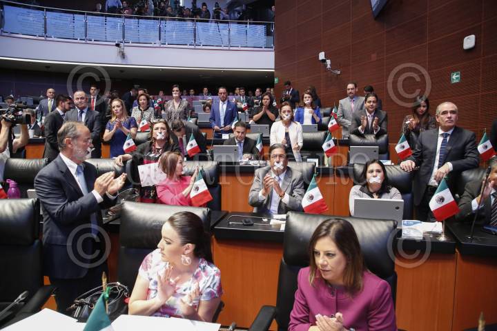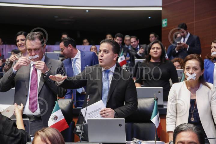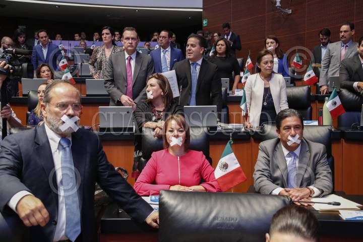 CIUDAD DE MÉXICO, 20SEPTIEMBRE2018.- Los senadores panistas: Gustavo Enrique Madero Muñoz, Minerva Hernández Ramos y Marco Antonio Gama Basarte, en símbolo de protesta se amordazaron debido a la propuesta de la Mesa Directiva que consiste en fijar 1 minuto desde los escaños para los participaciones y cinco minutos para la presentación de iniciativas. FOTO: CUARTOSCURO.COM