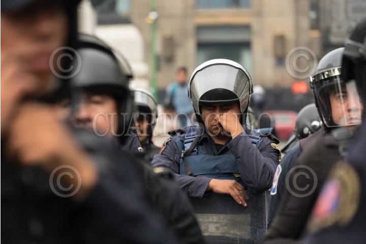 CIUDAD DE MÉXICO, 12JUNIO2018.- Un policía se quedó dormido durante el cierre de paso a trabajadores de la educación manifestantes. Maestros de la CNTE se manifestaron y marcharon por Reforma; miembros de la policía les impidieron el paso frente al llegar al Palacio de Bellas Artes, luego de 30 min los dejaron continuar, logrando pisar después de 4 años el Zócalo capitalino. Exigen que se realice una mesa de diálogo hacía la prorrogación de la Reforma Educativa. FOTO: ANDREA MURCIA /CUARTOSCURO.COM