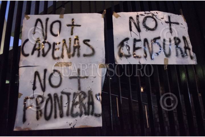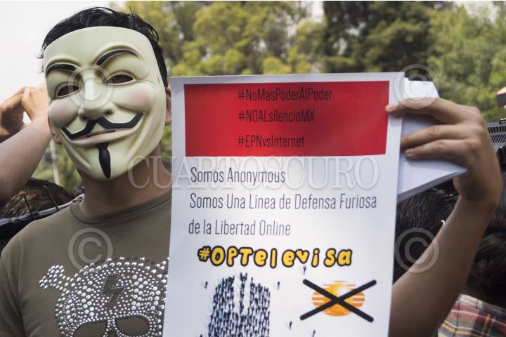MÉXICO, DF., 22ABRIL2014.- Integrantes de la sociedad civil marcharon del Ángel de la Independencia en contra de la llamada “Ley Telecom”, cuyas leyes secundarias es posible que se aprueben dentro de los próximos ocho días. Grupos como Contingente MX y el Colectivo Libre Internet protestaron con pancartas afuera de las instalaciones del Senado de la República. Confirmaron que el próximo sábado 26 de abril convocarán a una cadena humana que partirá de Televisa Chapultepec con rumbo hacia la residencia oficial de Los Pinos. Un grupo de autodenominados anarquistas intentaron derribar las rejas del Senado, sin embargo el grupo se replegó junto con el resto del contingente hacia las instalaciones de Televisa Chapultepec. FOTO: MARÍA JOSÉ MARTÍNEZ /CUARTOSCURO.COM