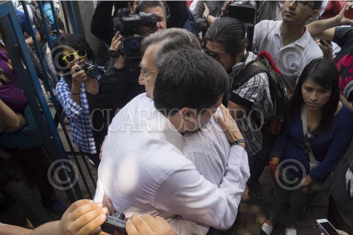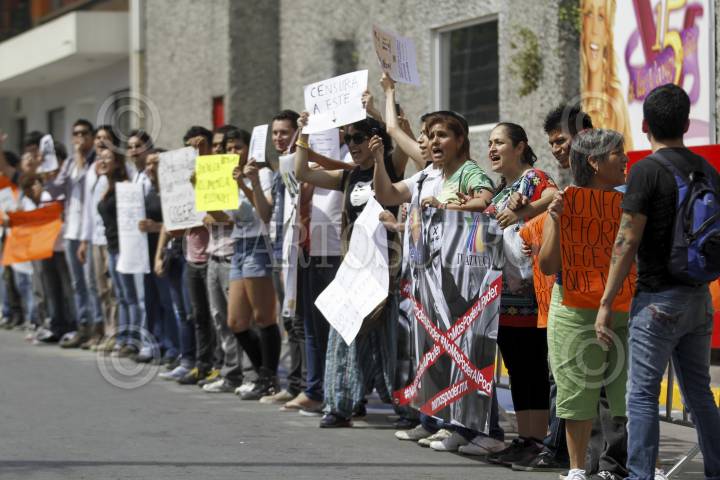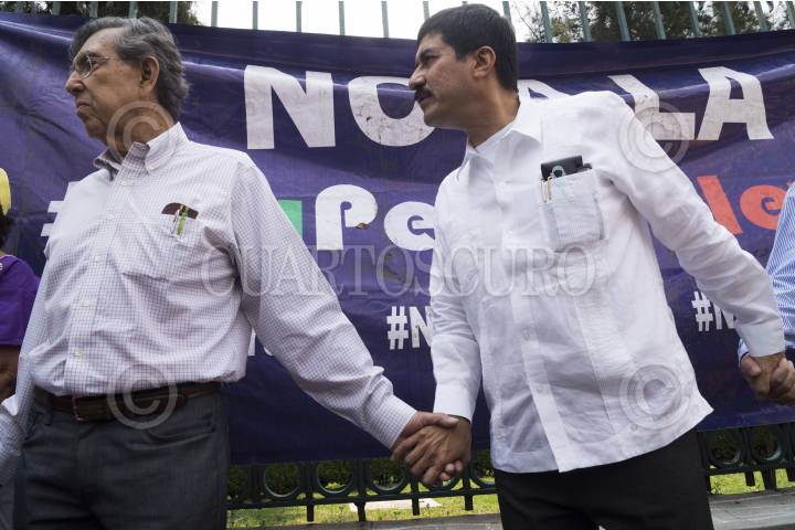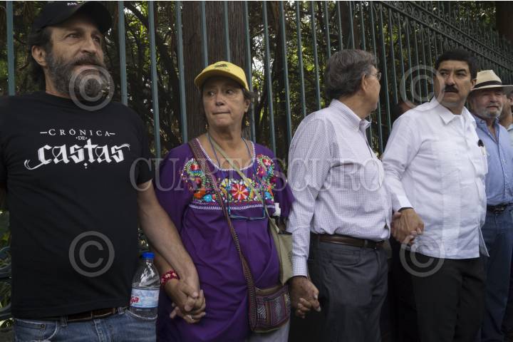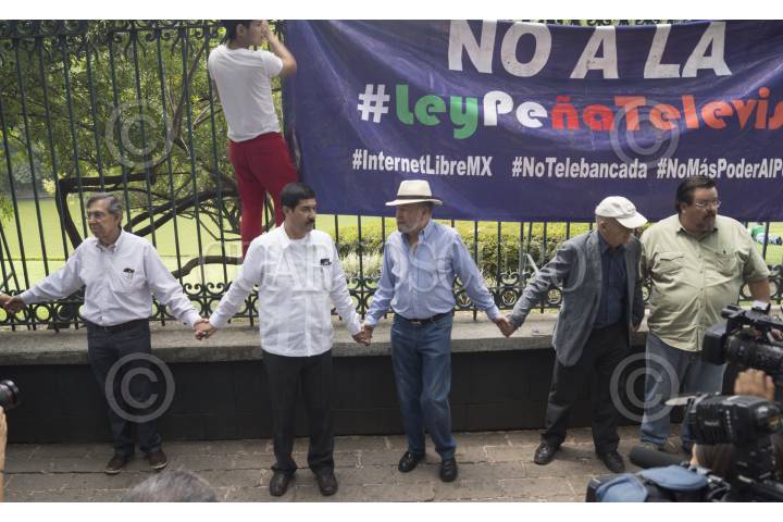 MÉXICO, DF., 26ABRIL2014.- Integrantes y partidarios del Frente por la Comunicación Democrática, encabezado por el Ing. Cuahtémoc Cárdenas, el senador panista Javier Corral, el actor Daniel Giménez Cacho, entre otros, convocaron a ciudadanos para formar una cadena humana en contra de la aprobación de la “Ley Telecom”, misma que conformaron desde la residencia oficial de Los Pinos, pasando por Metro Auditorio, la Estela de Luz, el Ángel de la Independencia, para finalizar como meta en las instalaciones de Televisa Chapultepec. Sin embargo, la logísitica fue interrumpida por un bloqueo de granaderos a la altura de Calzada de Chivatito. Los eslabones de la cadena humana se movilizaron hasta la Estela de Luz en donde Javier Sicilia y la periodista Denise Dresser los liderearían hasta el siguiente punto. FOTO: MARÍA JOSÉ MARTÍNEZ /CUARTOSCURO.COM