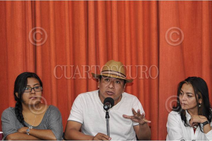MÉXICO, D.F., 13OCTUBRE2014.- Gisela Martínez de la Asociación Mundial de Radios Comunitarias México, Mardonio Carballo, escritor y poeta nahuatl, y Aleida Calleja, de la organización Observa.com, durante una conferencia de prensa en el Centro Nacional de Comunicación Social (Cencos) para hablar sobre las demandas de amparos que han realizado varias radios comunitarias, indígenas y productores independientes en contra de la Ley Federal de Telecomunicaciones y Radiodifusión ya que manifiestan es discriminatoria y tiene muchas restricciones para realizar programas con lenguas indígenas. FOTO: DIEGO SIMÓN SÁNCHEZ /CUARTOSCURO.COM