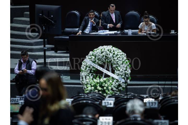 CIUDAD DE MÉXICO, 14OCTUBRE2024.- Diputados de la oposición ingresaron al pleno una corona de muertos con la leyenda “Murió la justicia” durante la sesión donde se ratificará las leyes secundarias de la Reforma Judicial. FOTO: ANDREA MURCIA /CUARTOSCURO.COM