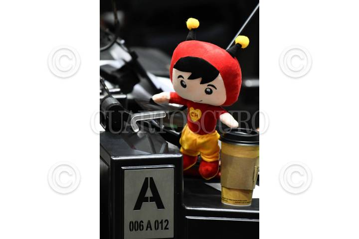 CIUDAD DE MÉXICO, 12MARZO2025.- Un peluche del "Chapulín Colorado" permanece en el curul de Abigail Arrendondo, diputada del PRI, quien fomenta una reforma que termine con "los chapulines legislativos", esto mientras se desarrolla la sesión ordinaria de la Cámara de Diputados en la que se discuten las leyes secundarias en materia de energía. FOTO: MARIO JASSO/CUARTOSCURO.COM