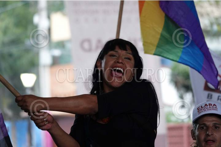 CIUDAD DE MÉXICO, 06AGOSTO2024.- Simpatizante de la comunidad LGBTTTIQ+ mostraó su apoyo a Clara Brugada, virtual Jefa de Gobierno, durante una Asamblea realizada en la Macroplaza de la alcaldía Iztapalapa. FOTO: GRACIELA LÓPEZ /CUARTOSCURO.COM