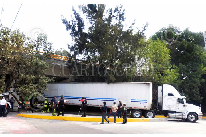 MÉXICO, D.F., 11MAYO2009.- Un Trailer quedo atorado bajo el puente que se ubica sobre calzada de La Viga al cruce con Rio Churubusco, en el lugar laboraron bomberos para lograr liberar este pesado vehículo por mas de una hora. Los hechos se registraron en perímetro de la Delegación Iztapalapa. FOTO: LUIS CARBAYO/CUARTOSCURO.COM