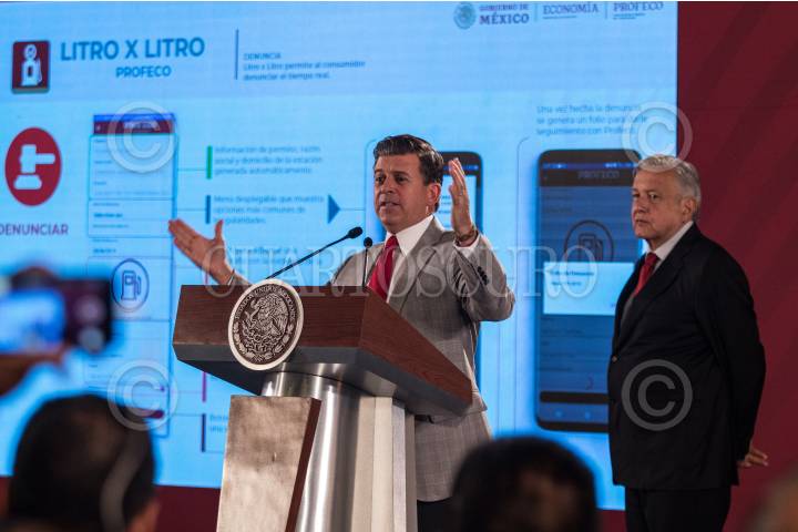CIUDAD DE MÉXICO, 02JULIO2019.- El presidente de la República, Andrés Manuel López Obrador, durante la conferencia matutina diaria en el Palacio Nacional, acompañado de Francisco Ricardo Sheffield Padilla, titular de la Profeco. FOTO: ANDREA MURCIA /CUARTOSCURO.COM