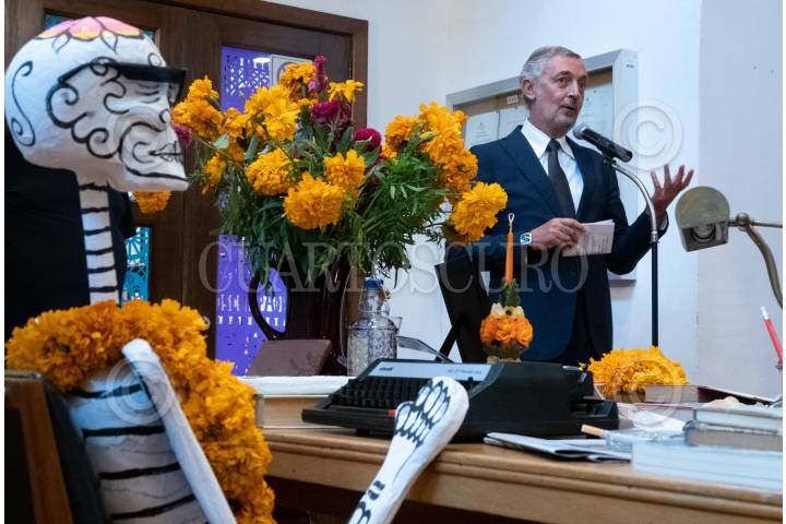 Luigi De Chiara durante la inauguración de la ofrenda en honor a las y los periodistas asesinados en México, en la Casa Italiana de Cultura.