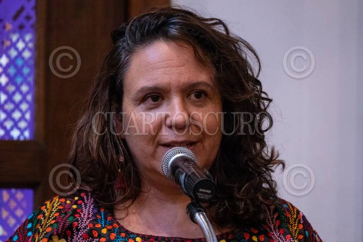 Marcela Turati durante la inauguración de la ofrenda en honor a las y los periodistas asesinados en México, en la Casa Italiana de Cultura.
