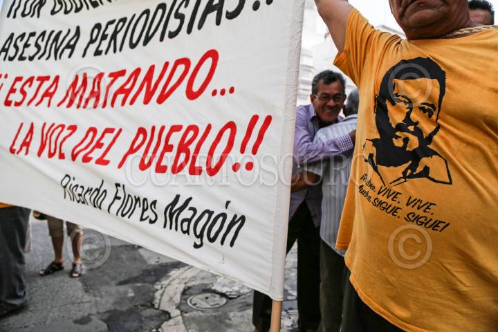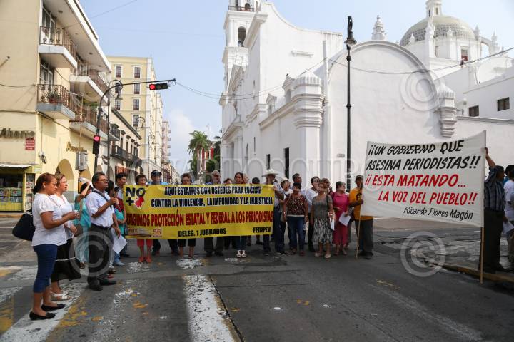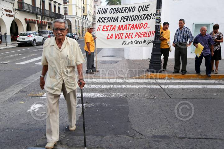 VERACRUZ, VERACRUZ, 07JUNIO17.- Ciudadanos y maestros jubilados cerraron la avenida Independencia para realizar un posicionamiento en el Día de la Libertad de Expresión, el cual consistió en exigir a las autoridades que se garantice la seguridad en el ejercicio periodístico. Además leyeron un texto dedicado a los profesionales de la comunicación y afirmaron que gracias a esta labor, su lucha como muchas otras no terminarán en el olvido. FOTO: ILSE HUESCA /CUARTOSCURO.COM