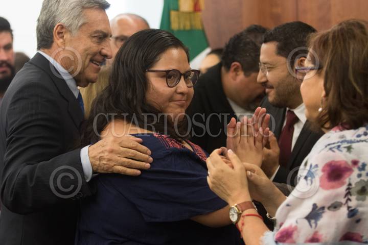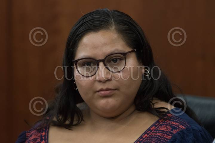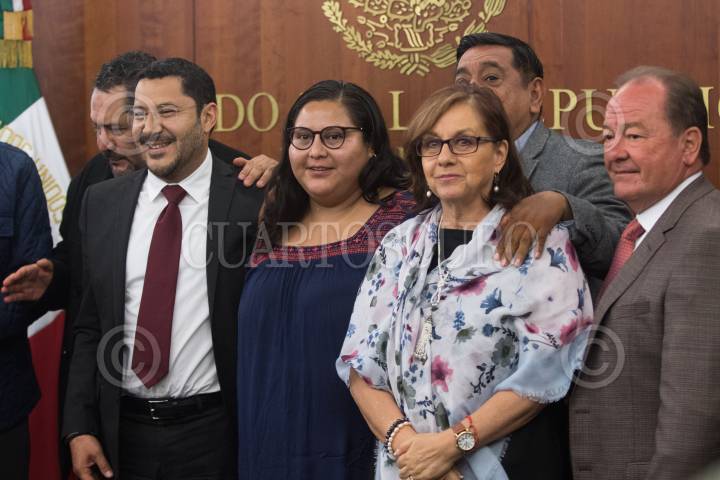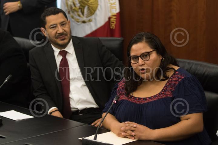 CIUDAD DE MÉXICO, 03JUNIO2019.- La senadora de Morena, Citalli Hernández, ofreció una conferencia de prensa para hablar sobre el incidente que le ocurrió la semana pasada cuando abrió un paquete que resulto ser un libro que le detonó en las manos, ella asegura que gracias a sus reflejos logró que este le causará lesiones mayores, aunque no quizo ahondar en detalles de los sucedido ya que indicó que las investigaciones las esta llevando la FGR, en el encuentro con medios estuvo acompañada de varios senadores de bancada. FOTO: MOISÉS PABLO /CUARTOSCURO.COM