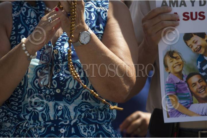 Una mujer sostiene un rosario al manifestarse en contra de la distribución de los nuevos libros de texto de la SEP en Nuevo León.