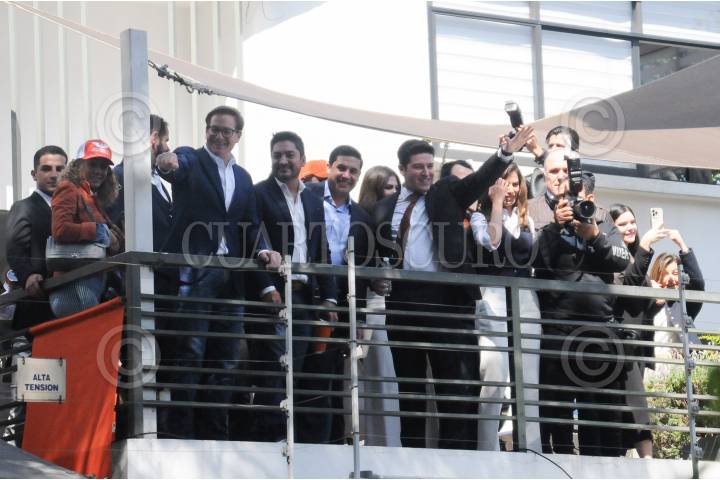 CIUDAD DE MÉXICO, 12NOVIEMBRE2023. - Samuel García, acompañado de integrantes de Movimiento Ciudadano, saluda a sus simpatizantes desde la terraza del edificio sede. FOTO: DANIEL AUGUSTO /CUARTOSCURO.COM