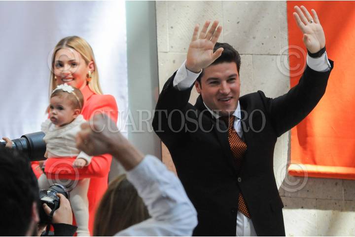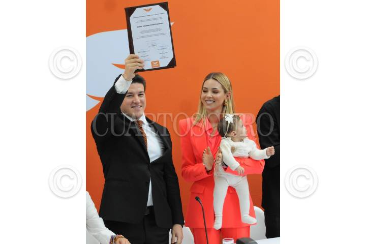 CIUDAD DE MÉXICO, 12NOVIEMBRE2023.-Acompañado por su esposa, Mariana Rodríguez y su hija, el gobernador con licencia, Samuel García acudió a las instalaciones de Movimiento Ciudadano para registrarse como aspirante a la candidatura presidencial por ese partido. FOTO: DANIEL AUGUSTO /CUARTOSCURO.COM