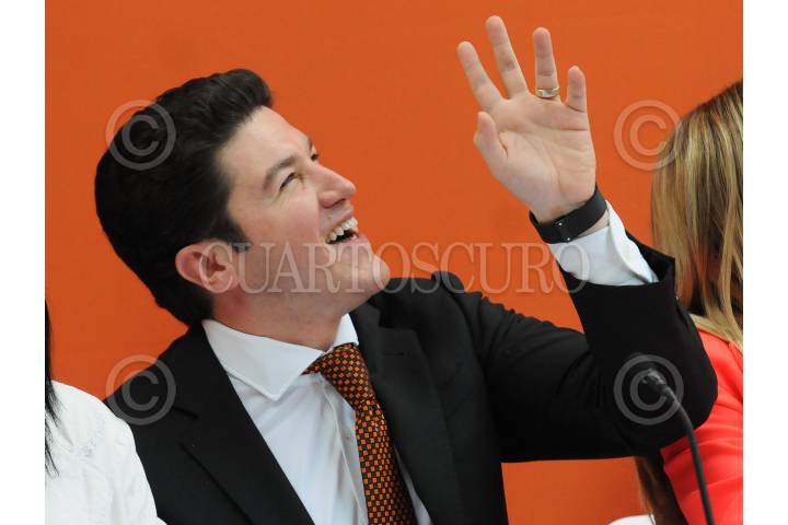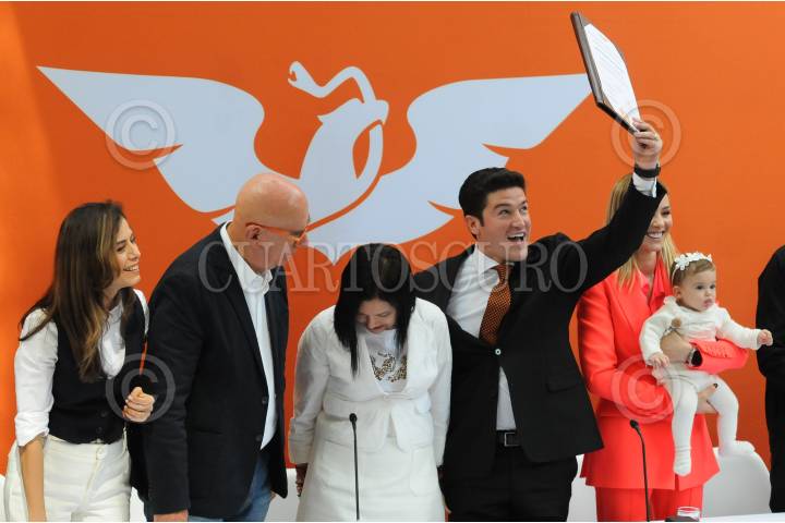 CIUDAD DE MÉXICO, 12NOVIEMBRE2023. - Samuel García muestra el documento que lo avala como aspirante a la candidatura presidencial por parte de Movimiento Ciudadano. FOTO: DANIEL AUGUSTO /CUARTOSCURO.COM