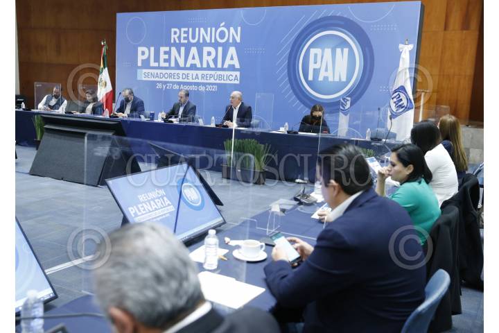 Marko Cortés, líder nacional del PAN, y Julen Rementería, coordinador de los senadores panistas, durante los trabajos de la plenaria de los senadores blaquiazules.
