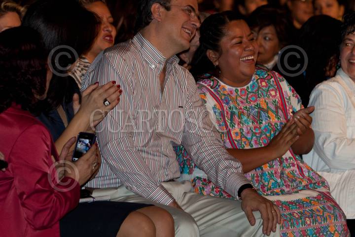 MÉXICO, D.F., 29OCTUBRE2011.- Marcelo Ebrard Casaubón, Jefe de Gobierno, y Martha Sánchez, coordinadora de la Alianza de Mujeres Indígenas de Centroamérica y México, durante el evento “Mil mujeres lideresas con Marcelo Ebrard”, en el WTC, las cuales fueron convocadas a través de las redes sociales. FOTO: MOISÉS PABLO/CUARTOSCURO.COM
