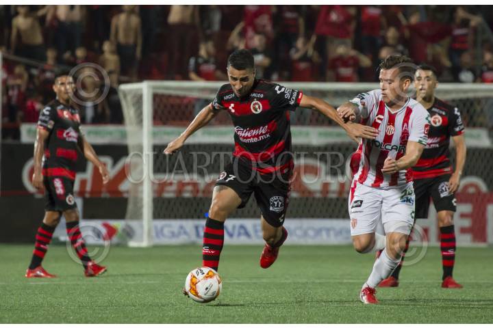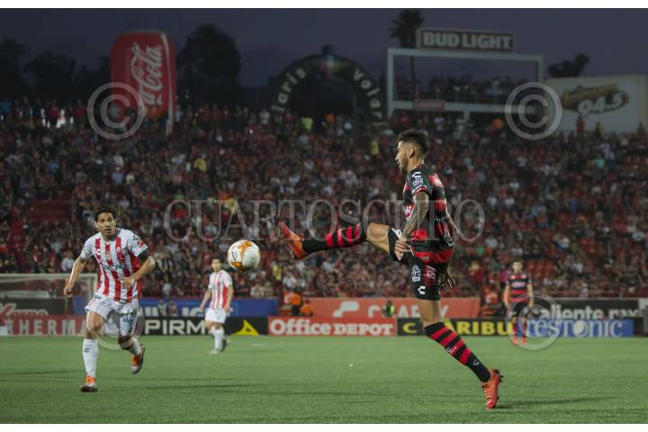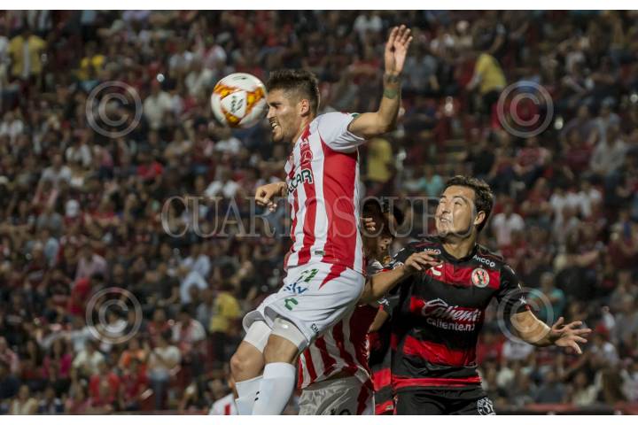 TIJUANA BAJA CALIFORNIA, 31AGOSTO2018.- Hernán González disputa el balón con Rubén González durante el partido entre Xoloitzcuintles de Tijuana contra los Rayos de Necaxa realizado en el estadio Caliente, como parte de la Jornada 08 del Torneo de Apertura 2018 de la Liga MX. Marcador final: Tijuana 1, Necaxa 0. FOTO: OMAR MARTÍNEZ /CUARTOSCURO.COM