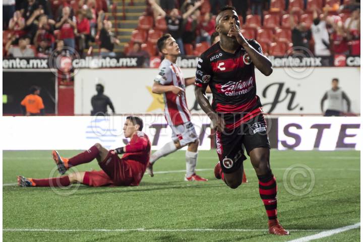 TIJUANA BAJA CALIFORNIA, 31AGOSTO2018.- Miler Bolaños festeja el gol anotado durante el partido entre Xoloitzcuintles de Tijuana contra los Rayos de Necaxa realizado en el estadio Caliente, como parte de la Jornada 08 del Torneo de Apertura 2018 de la Liga MX. Marcador final: Tijuana 1, Necaxa 0. FOTO: OMAR MARTÍNEZ /CUARTOSCURO.COM
