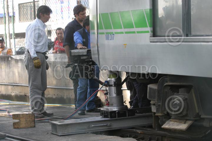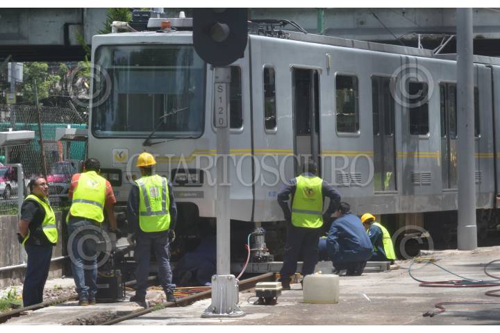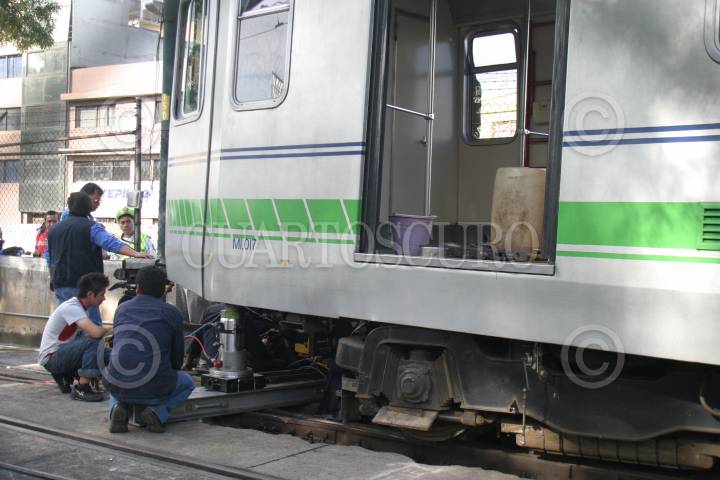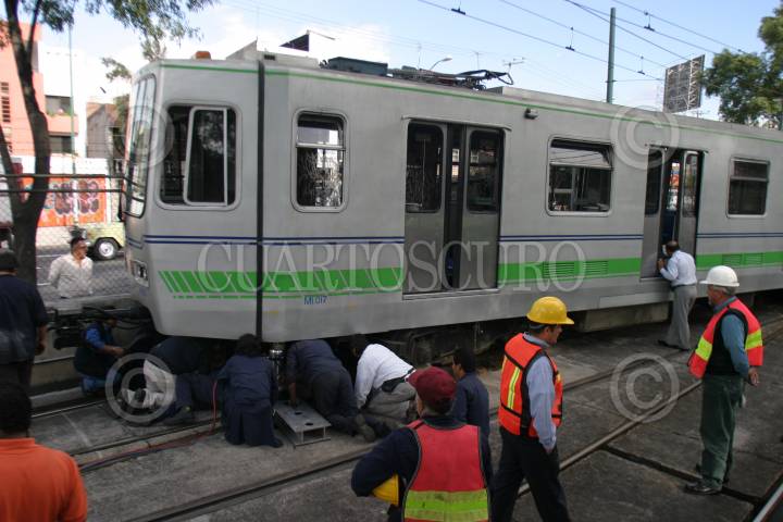 MÉXICO, D.F., 08SEPTIEMBRE2010.- Un convoy del Tren Ligero se descarrilo entre las estaciones Nezahualpilli y Xotepingo, trabajadores del Servicio de Transportes Eléctricos del DF, trabajan para ponerlo en las vias. En el lugar no se registró ningún lesionado. FOTO: SAÚL LÓPEZ/CUARTOSCURO.COM
