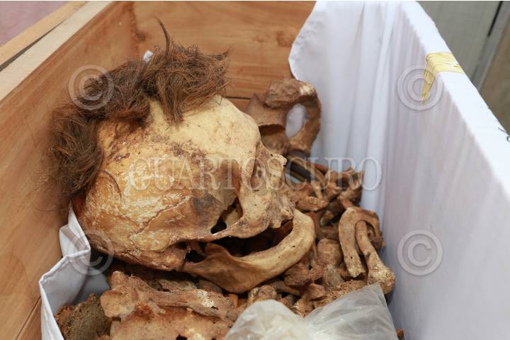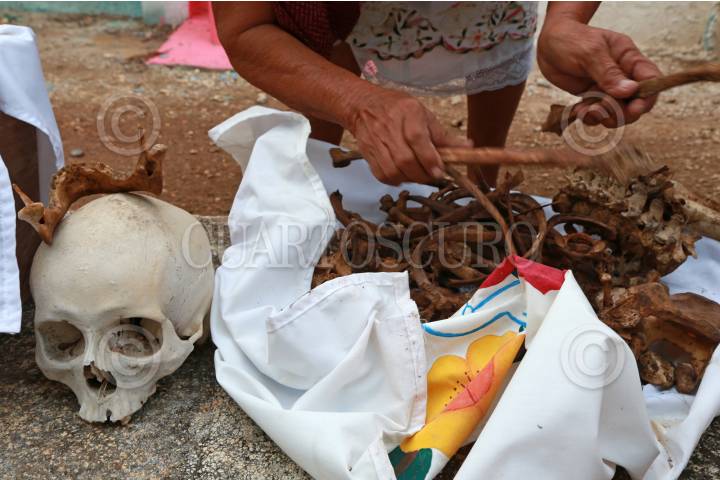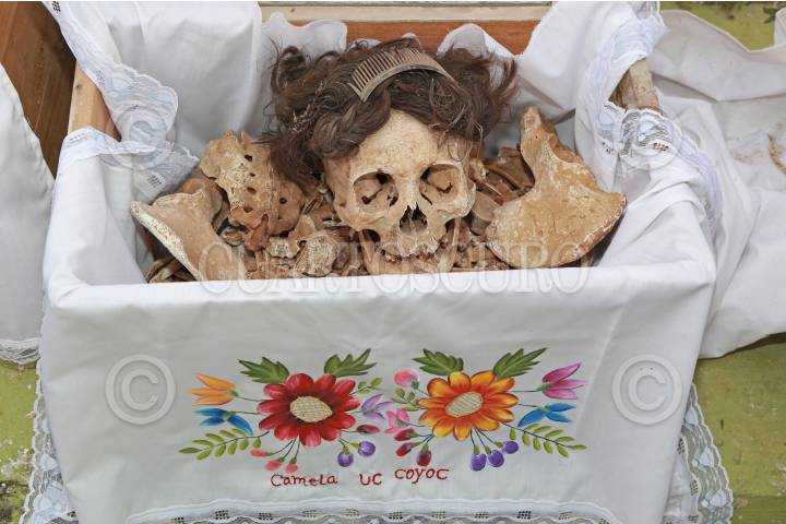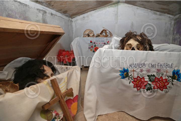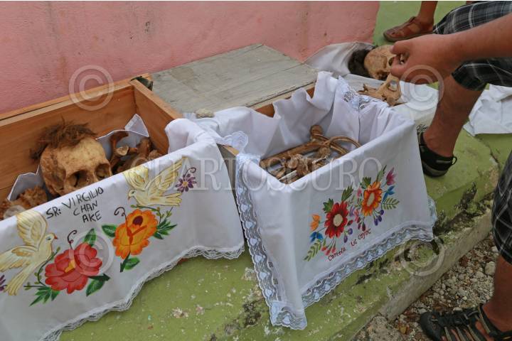 POMUCH, CAMPECHE, 01NOVIEMBRE2016.- La limpia de huesos o Choo Ba'ak es una tradición prehispánica que se realiza cada año en el poblado de Pomuch. Tres años después del deceso de las personas, sus familiares retiran los esqueletos del cementerio para depositarlos en cajas adornadas. La limpia de huesos consiste en que un familiar encargado retire el polvo de las osamentas y cambie la manta tradicional que adorna las cajas en las que los restos son depositados. FOTO: MAIRA TULIA/ CUARTOSCURO.COM