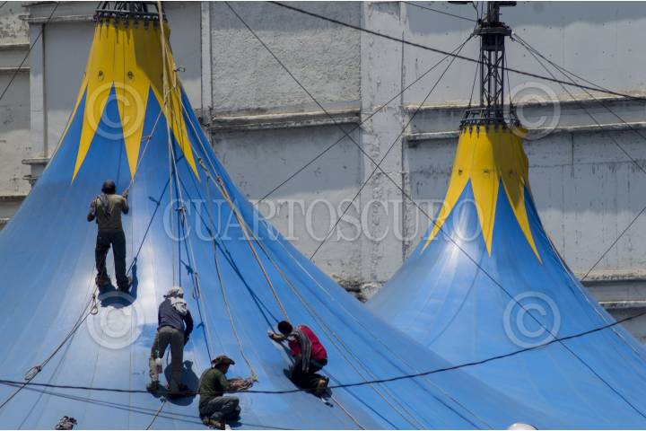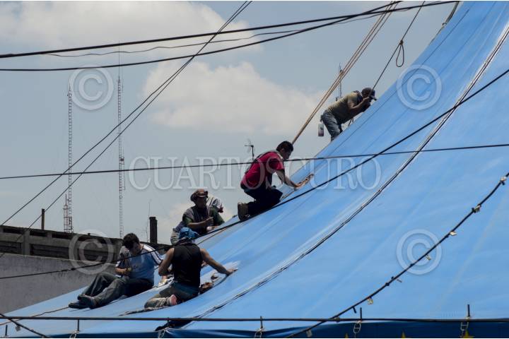 CIUDAD DE MÉXICO, 28JUNIO2016.- Trabajadores del circo ubicado en avenida Insurgentes a un costado del metrobús El Chopo limpiaron la lona del establecimiento. FOTO: GALO CAÑAS /CUARTOSCURO.COM