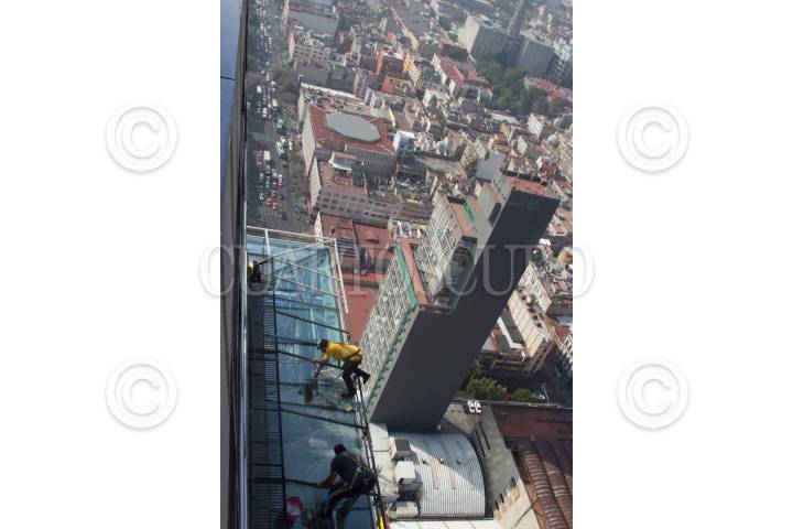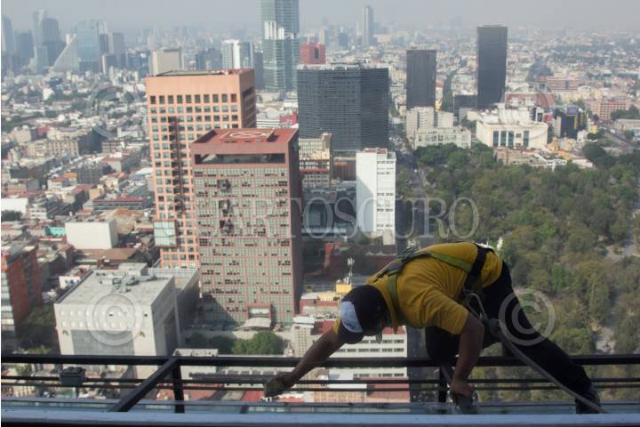 MÉXICO, D.F., 11JUNIO2008.- Limpiadores enmascaradados cuelgan en las alturas para limpiar los ventanales de un centro de negocios. FOTO: RODOLFO ANGULO/CUARTOSCURO.COM