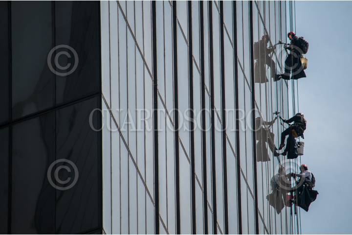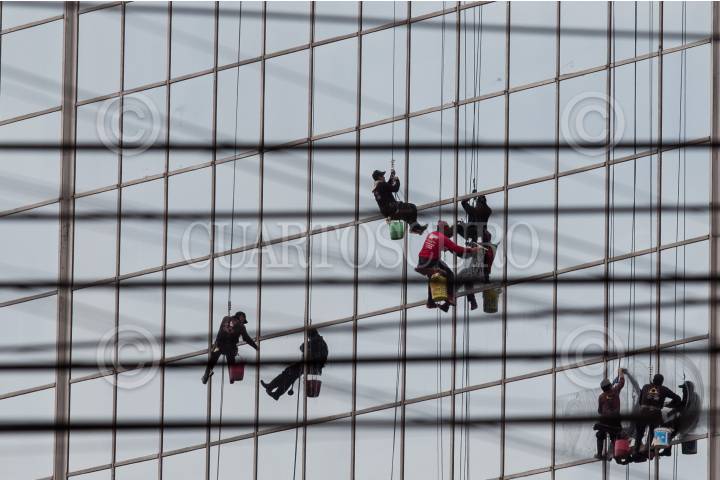 CIUDAD DE MÉXICO, 20FEBRERO2018.- Tres hombres desafían las alturas para limpiar los vidrios de un edificio sobre la avenida Paseo de la Reforma. FOTO: DIEGO SIMÓN SÁNCHEZ /CUARTOSCURO.COM
