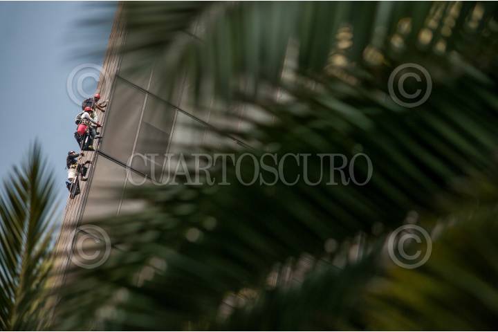 CIUDAD DE MÉXICO, 17DICIEMBRE2017.- Un grupo de limpiavidrios cuelgan de uno de los hoteles de la zona de Polanco. FOTO: GALO CAÑAS /CUARTOSCURO.COM