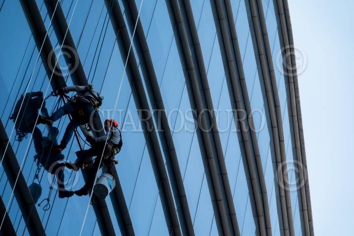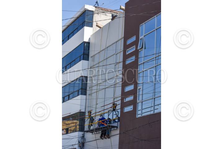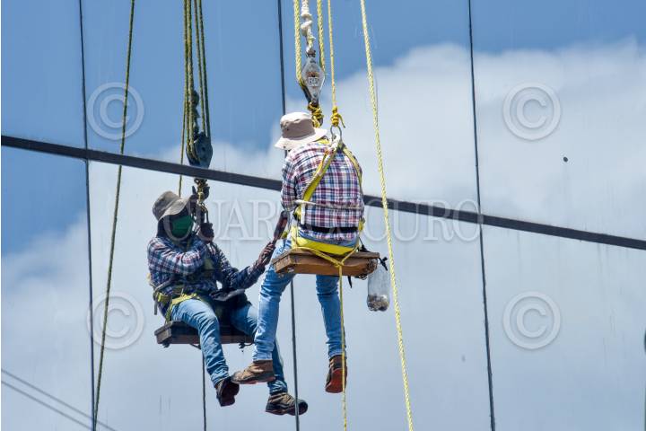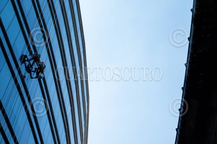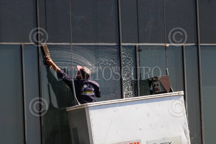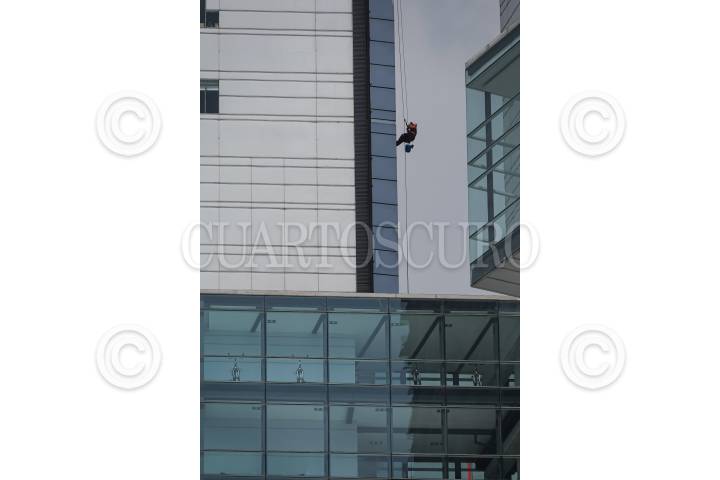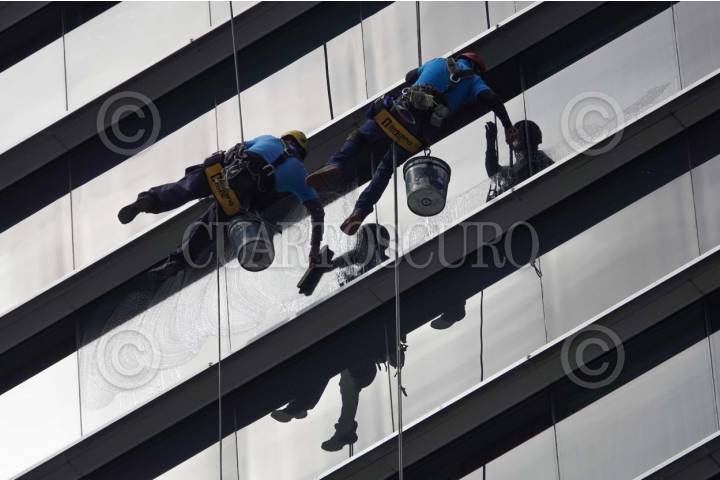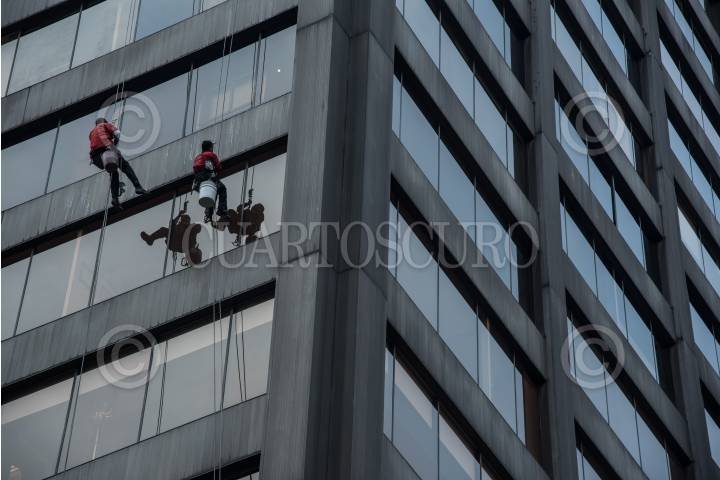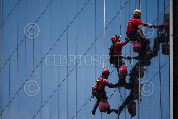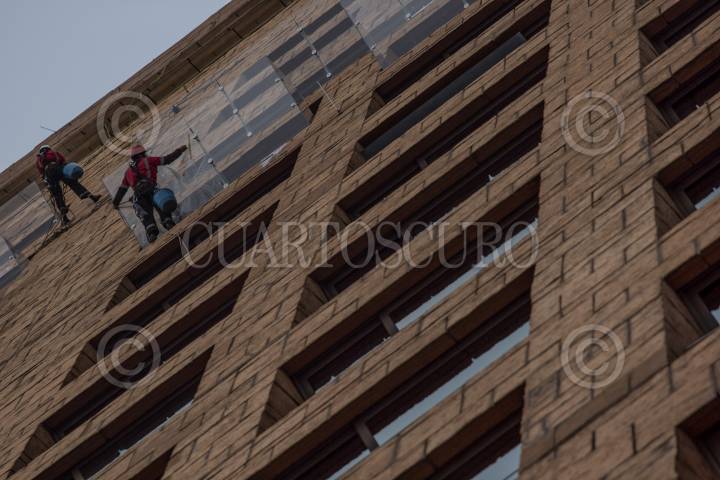 Un limpiavidrios desciende entre los exclusivos edificios de Santa Fe para realizar su labor.