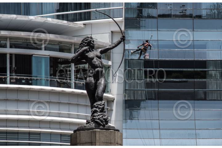 CIUDAD DE MÉXICO, 21JULIO2018.- Un "limpia vidrios" realiza su trabajo al exterior de un edificio ubicado a un costado de la Fuente de la Diana Cazadora FOTO: MARIO JASSO /CUARTOSCURO.COM