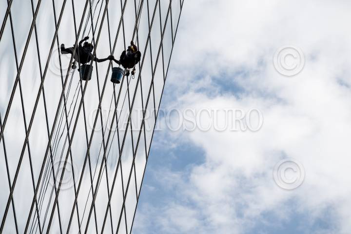 Un hombre realiza la limpieza de vidrios de un edificio en donde se reflejan las nubes.