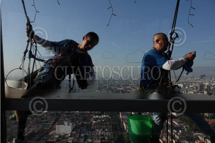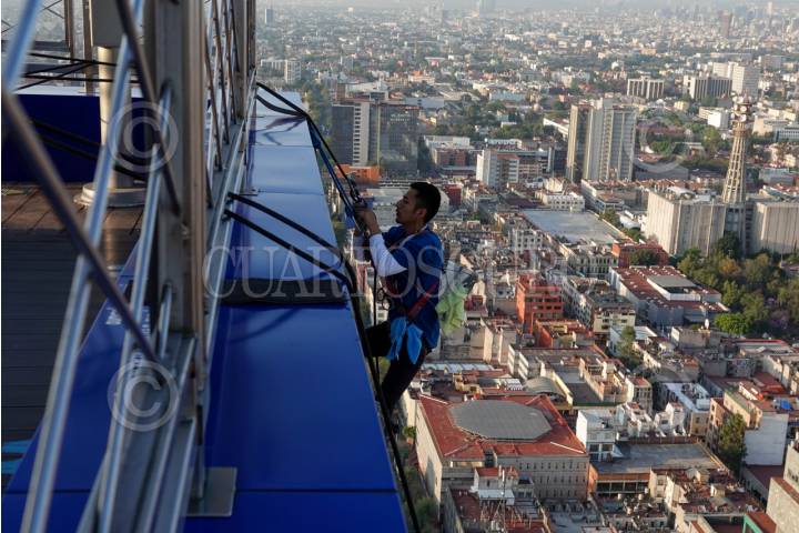 CIUDAD DE MÉXICO, 20MARZO2024.- Suspendidos a más de 100 metros de altura, los limpiavidrios de la Torre Latinoamericana comienzan sus labores desde las primeras horas del día para culminar la limpieza de los 44 pisos del primer rascacielos en la capital del país. Esta labor se realiza mes con mes y se utiliza un desengrasante especial para su ejecución. FOTO: GALO CAÑAS/CUARTOSCURO.COM