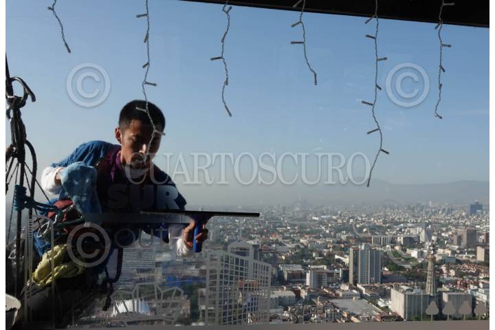Trabajador limpiavidrios en la alcaldía de Benito Juárez.