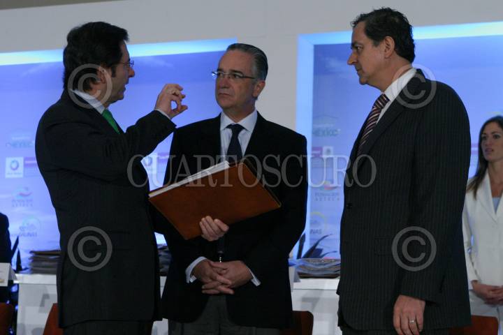 MÉXICO, D.F., 26OCTUBRE2009.- Esteban Moctezuma Barragán, director de la Fundación Azteca; Ricardo Salinas Pliego, presidente de Grupo Salinas, y Juan Rafael Elvira Quesada, Secretario de Medio Ambiente y Recursos Naturales (SEMARNAT) estuvieron presentes en la premiación del concurso ¨Limpiemos Nuestro México¨. FOTO: IVÁN STEPHENS/CUARTOSCURO.COM