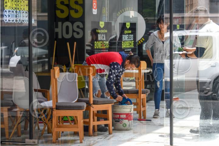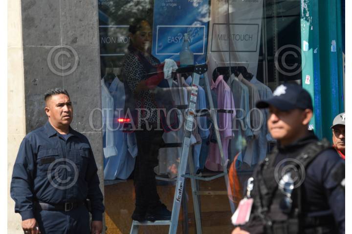 TOLUCA, ESTADO DE MÉXICO, 02MAYO2025.- Una mujer limpia vidrios desde el interior de un negocio en la capital mexiquense mientras la gente pasa por la calle. FOTO: CRISANTA ESPINOSA AGUILAR /CUARTOSCURO.COM
