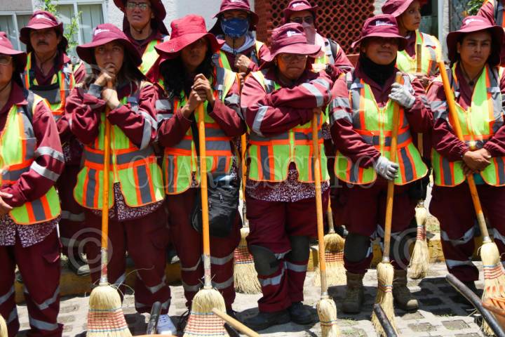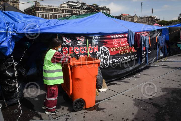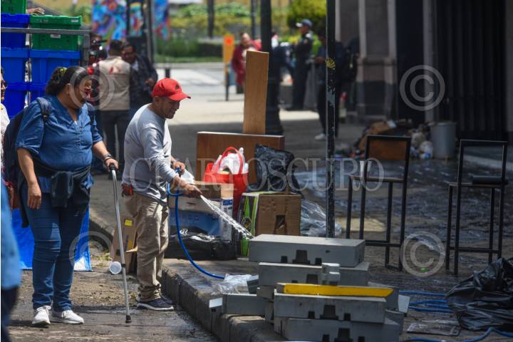 CIUDAD DE MÉXICO, 29MAYO2025.- Una trabajadora de limpieza realiza su jornada en el plantón que la Coordinadora Nacional de Trabajadores de la Educación (CNTE) mantiene en la plancha del zócalo capitalino. FOTO: MARIO JASSO/CUARTOSCURO.COM