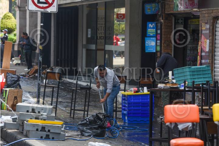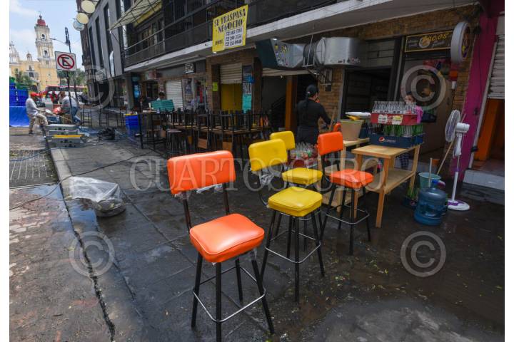 TOLUCA, ESTADO DE MÉXICO, 24JULIO2025.- Comerciantes de la calle Rivapalacio en la ciudad de Toluca sacaron el mobiliario de sus comercios para realizar labores de limpieza después de que sus negocios se vieran afectados por la lluvia registrada la noche del miércoles en el Valle de Toluca, el agua entró a 17 comercios. FOTO: CRISANTA ESPINOSA AGUILAR /CUARTOSCURO.COM