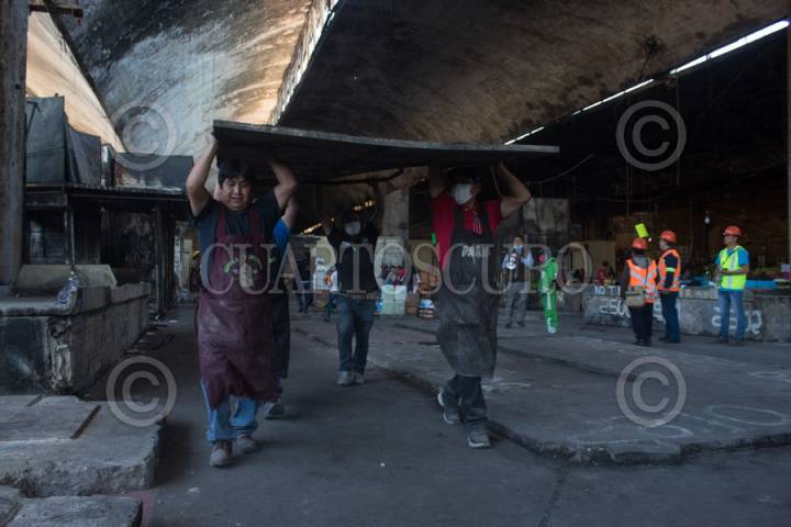 A seis días del incendio ocurrido la noche del 24 de diciembre en el mercado de la Merced, el cual dejo 630 locales quemados, comerciantes continúan con la remoción de escombros y limpieza. FOTO: MAGDALENA MONTIEL/CUARTOSCURO.COM