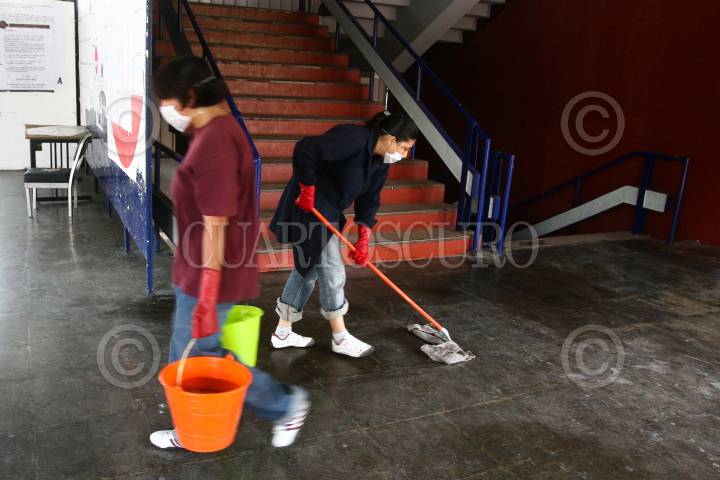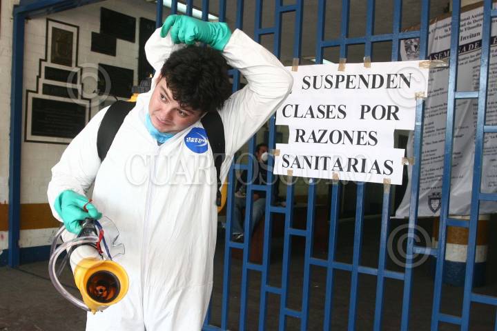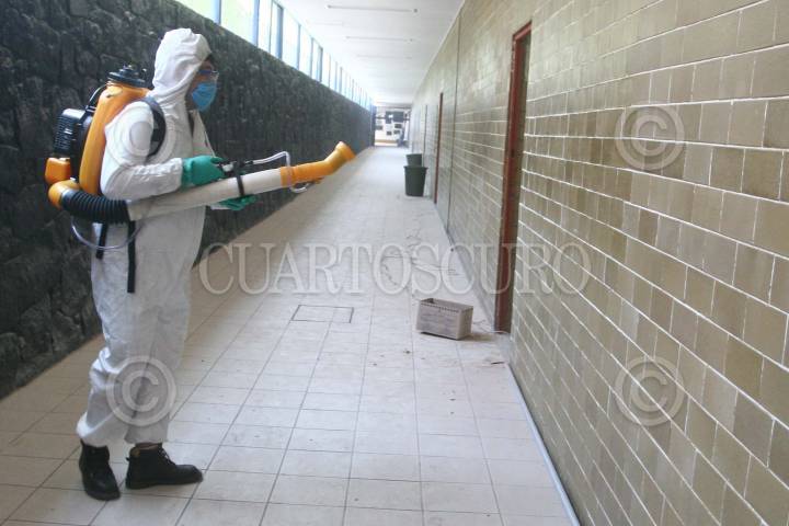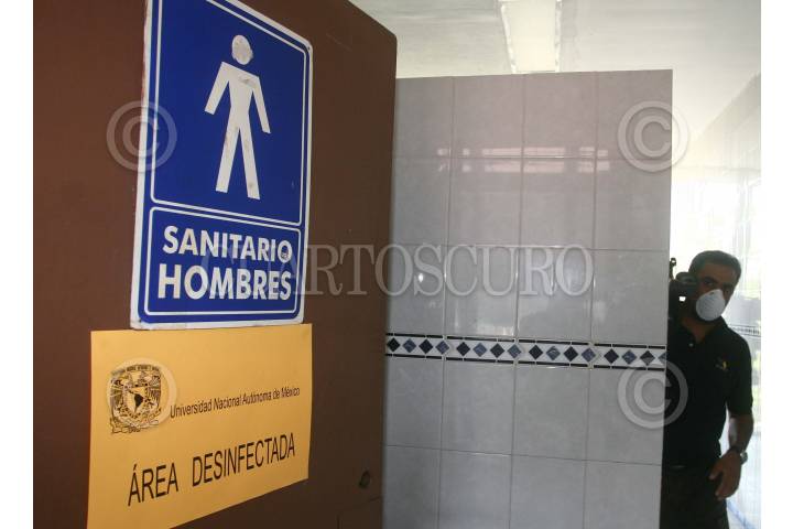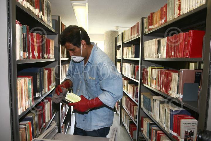 MÉXICO, D.F., 05MAYO2009.- Trabajadores de sanitizacion y limpieza de la UNAM trabajan a marchas forzadas para desinfectar, salones, laboratorios, auditorios, bibliotecas, oficinas, sanitarios, libros, computadoras, areas deportivas, y espacios publicos de Ciudad Universitaria, debido al reinicio de actividades el proximo 7 de Mayo. Estas medidas de sanidad, forman parte de las recomendaciones que indico la Secretaria de Salud, debido al brote de influenza humana que vive la capital. FOTO: SAUL LOPEZ/CUARTOSCURO.COM