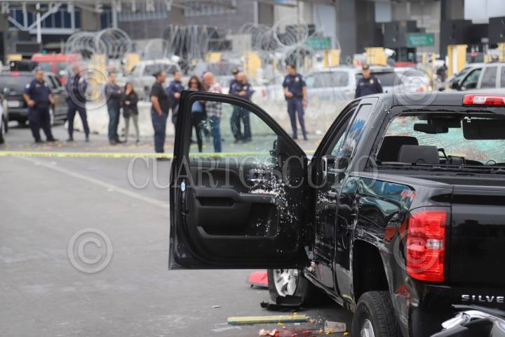 TIJUANA BAJA CALIFORNIA, 13MAYO2019.- Una persona de origen estadounidense fue detenido por agentes de la Policía Municipal tras protagonizar una persecución hasta la garita internacional de San Ysidro. De acuerdo a información oficial, el detenido amagó con una navaja a un ciudadano en la avenida Manuel Márquez de León de la Zona Río. El conductor se dio a la fuga abordo de un vehículo Chevrolet Silverado con dirección a los carriles izquierdos de la garita internacional. Durante la persecución impactó a 17 automóviles, atropelló a 5 personas y a 14 vendedores ambulantes que se encontraban en la garita. Al detenerse el vehículo los comerciantes de la garita bajaron a golpes al conductor, mismo que fue puesto a disposición de agentes del Ministerio Público. FOTO: OMAR MARTÍNEZ /CUARTOSCURO.COM