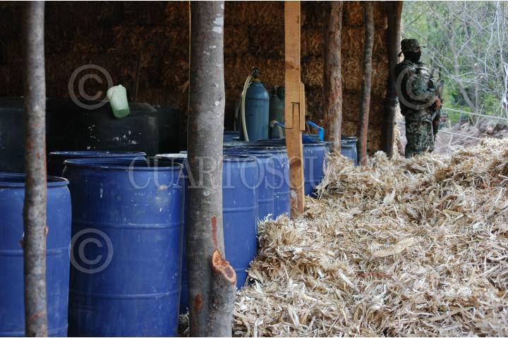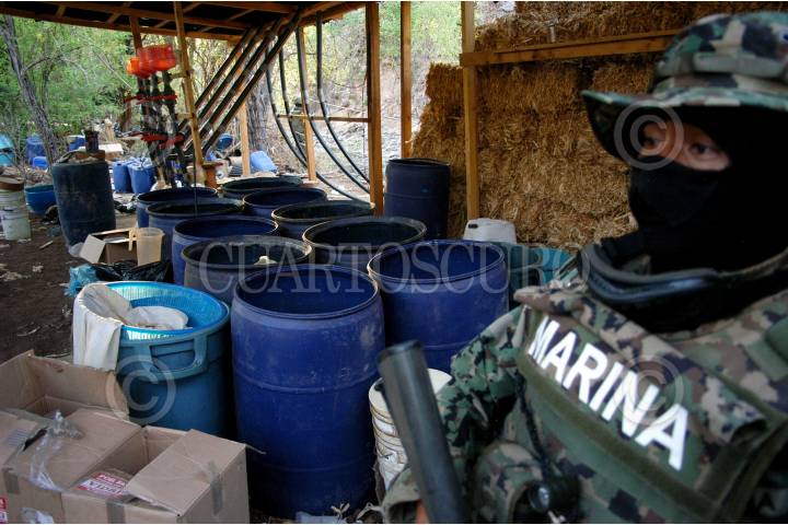 HUAJOTE, SINALOA, 12JUNIO 2009.- Personal de Infantería de Marina, adscrito a la Cuarta Región Naval, con sede en Guaymas, durante un operativo aseguraron una cifra record de cerca de 50 mil litros de efedrina líquida, en un narcolaboratorio descubierto el día de ayer aproximadamente a 46 kilómetros al norte de Culiacán, dicha sustancia encontrada servía para la elaboración de la droga sintética conocida como “cristal”, a base de efedrina líquida, aunado a lo anterior, encontró en el sitio 4 mil 400 litros de gasolina, 3 mil 250 kilogramos de yodo granulado, mil 850 litros de ácido hipofosfórico y un depósito para agua con capacidad de entre 20 a 25 mil litros. FOTO: GUILLERMO PEREA/CUARTOSCURO.COM