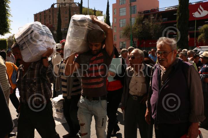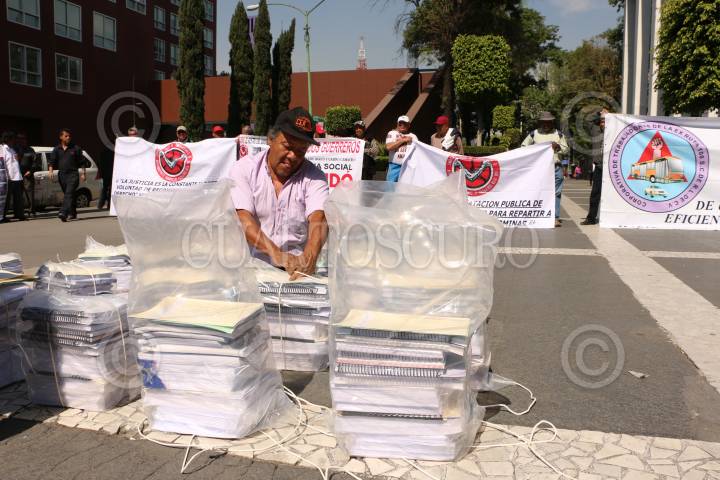 CIUDAD DE MÉXICO, 31ENERO2019.- El Sindicato Único de trabajadores de Autotransportes de Pasajeros de la Ruta 100, trasladó hasta las puestas del Tribunal Superior de Justicia de la Ciudad de México, media tonelada de expedientes acusatorios, los cuales se han ido acomunado en los últimos 24 años, desde 1995 año en el que los conflictos con la ya extinta ruta 100 comenzaron. Los miembros de este sindicato exigen una resolución a la lucha de más de dos décadas, en donde solicitan la devolución del 30% de su liquidación, la cual aportaron para la creación del fideicomiso, ante el inminente cierre de la ruta transportista. FOTO: ROGELIO MORALES /CUARTOSCURO.COM
