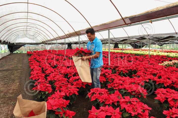 MÉXICO, D.F., 27NOVIEMBRE2015.- La producción de la Flor de Pascua, conocida como "Nochebuena" pues sus hojas se tiñen de color rojo en la época navideña, es una de las actividades económicas más redituables de la zona. En promedio, una nochebuena requiere 8 meses de cultivo, condiciones especiales de temperatura y riego, para lograr el color escarlata. Existen por lo menos 17 variedades diferentes cuyas hojas son moteadas, blancas, amarillas, o completamente rojas. FOTO: MARÍA JOSÉ MARTÍNEZ /CUARTOSCURO.COM