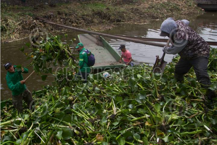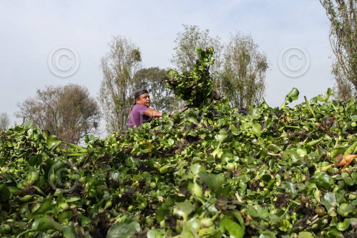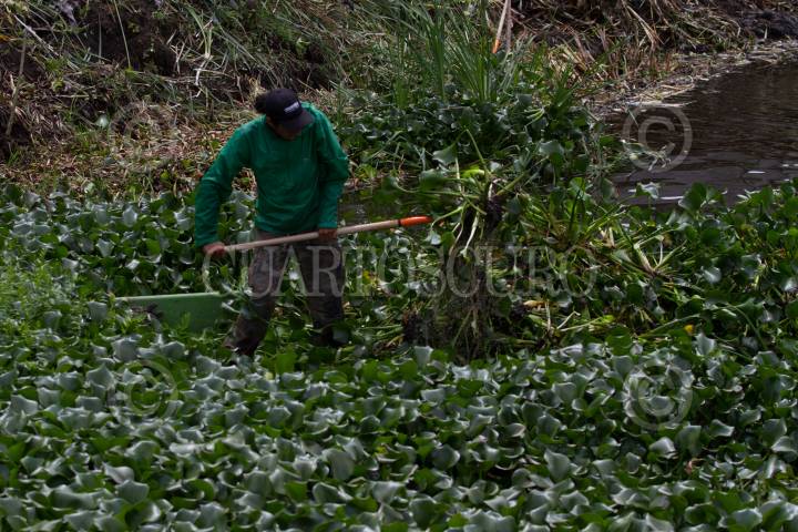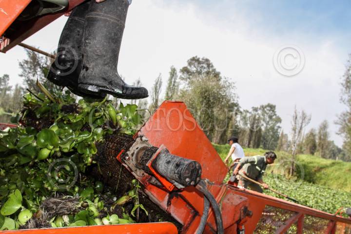 MÉXICO, D.F., 09ENERO2016.- Infestados por lirio acuático, conocido popularmente como “huachinango”, subsisten contaminados la mayoría de los 180 kilómetros de canales en la zona lacustre de Xochimilco. El crecimiento exponencial de esta planta flotadora y su facilidad para reproducirse lo ha convertido en una plaga; en algunos canales la capa de lirio rebasa el metro de altura. La proliferación del también llamado “jacinto de agua”entorpece el paso de las canoas y trajineras, principal medio de transporte en la zona de canales, lo que dificulta la salida de la mercancía más allá de los canales anegados de lirio. Xochimilco es el mayor productor de plantas ornamentales, flores y hortalizas del Distrito Federal, por lo que la actividad económica de la región recae con gran peso en la actividad de cultivo. Un equipo de trabajo conformado por 16 hombres limpia constantemente los canales de la acumulación de lirio y fango; la mayor parte del trabajo es “a mano”, de manera casi artesanal con ayuda de un bielgo, una especie de trinchete, con el que juntan el huachinango. En algunos canales en donde la plaga del lirio es demasiada utilizan una máquina cosechadora de lirio para su recolección. Posteriormente el lirio alcanza una etapa productiva al ser empleado como fertilizante para las cosechas chinamperas. La delegación Xochimilco se ha propuesto como meta la limpieza absoluta de los canales en el lapso de un año. FOTO: MARÍA JOSÉ MARTÍNEZ /CUARTOSCURO.COM