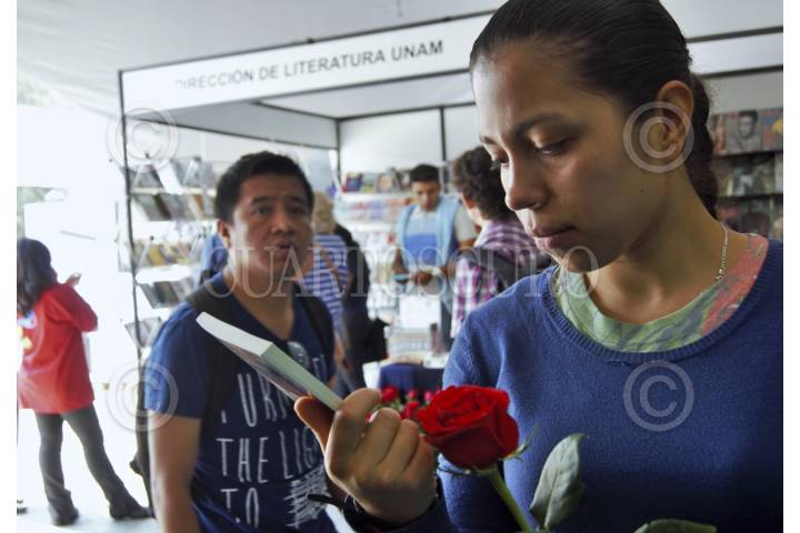 MÉXICO, D.F., 23ABRIL2014.- En el marco del Día Internacional del Libro, cientos de lectores, estudiantes, jóvenes y adultos acudieron a la explanada principal del Centro Cultural Universitario de la UNAM para participar en la Feria del Libro y la Rosa 2014. Subastas de libros, conferencias, talleres de literatura y cine, funciones gratuitas de teatro y firma de autógrafos son sólo algunas actividades que forman parte de la agenda de esta tarde. FOTO: MARÍA JOSÉ MARTÍNEZ /CUARTOSCURO.COM