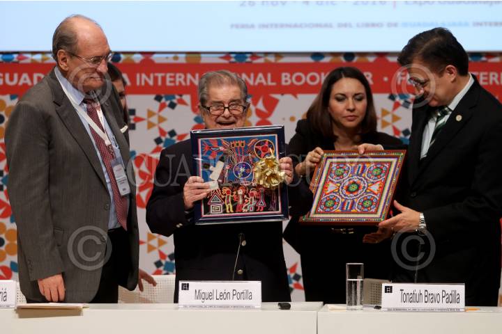 GUADALAJARA, JALISCO. 01DICIEMBRE2016.- Miguel León –Portilla, fue homenajeado en el Encuentro de Literaturas en Lenguas Originarias de América, esto en el marco de la edición 30 de la Feria Internacional del Libro de Guadalajara FIL, que se lleva a cabo en la Expo del 26 de noviembre al 04 de diciembre. FOTO : FERNANDO CARRANZA GARCIA / CUARTOSCURO.COM