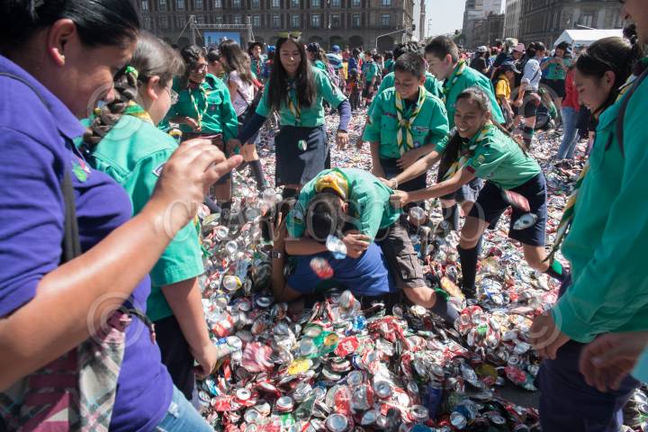 CIUDAD DE MÉXICO, 24MARZO2018.- Miguel Ángel Mancera, Jefe de Gobierno de la Ciudad de México, presidió la edición 14 de la formación de la flor de Liz más grande del mundo en el Zócalo Capitalino. Esta es el emblema scout mundial y representa compromiso, identidad y hermandad, de más de 40 millones de jóvenes del mundo. Un total de un millón 485 mil latas aplastadas dieron forma a esta flor. FOTO:CUARTOSCURO.COM
