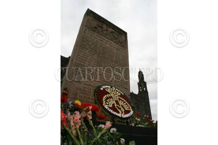 MEXICO,D.F.,02OCTUBRE2007.- En la plaza de la Tres Culturas en Tlatelolco se realizó un evento conmemorativo por el 02 octubre, por parte del Gobierno del Distrito Federal en donde asistió Martí Batres, secretario de Desarrollo Social, José Muñoz Soria, delegado de la Cuahtémoc y Salvador Martínez De lla Rocca conocido como el "El pino".En la imagen, la corona floral depositada a los pies de la placa conmemorativa.FOTO:ROCIO ORTIZ/CUARTOSCURO.COM