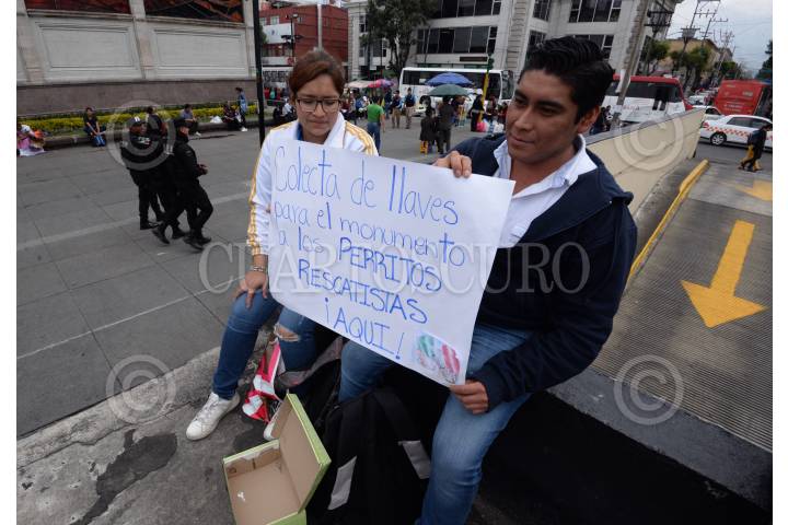 TOLUCA, ESTADO DE MEXICO, 02OCTUBRE2017.- Abigail y Eduardo, estudiantes de Ingeniería en Sistemas, se unieron a la colecta nacional de llaves para realizarles un monumento a los perros rescatistas, que apoyaron durante las labores de recate después del sismo del 19 de septiembre. Los promotores mencionaron a la perra Frida de la Marina que ayudaron con la búsqueda de personas entre los escombros. FOTO: ARTEMIO GUERRA BAZ /CUARTOSCURO.COM