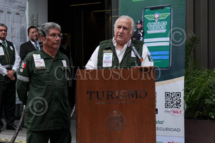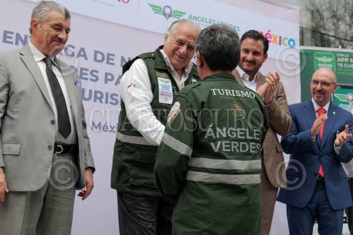 CIUDAD DE MÉXICO, 24JUNIO2024.- César Garizurieta, Director General de Normalización y Verificación; Miguel Torruco, Secretario de Turismo; Juan Enrique Suárez del Real Tostado, Secretario de Turismo del Estado de Nayarit y Octavio de la Torre de Stéfano, Presidente de la Confederación de Cámaras Empresariales (CONCANACO SERVYTUR); entregaron llaves a miembros de las nuevas patrullas de la Unidad de Ángeles Verdes de servicios al turista para fortalecer el turismo carretero. FOTO: ALICE MORITZ/CUARTOSCURO.COM